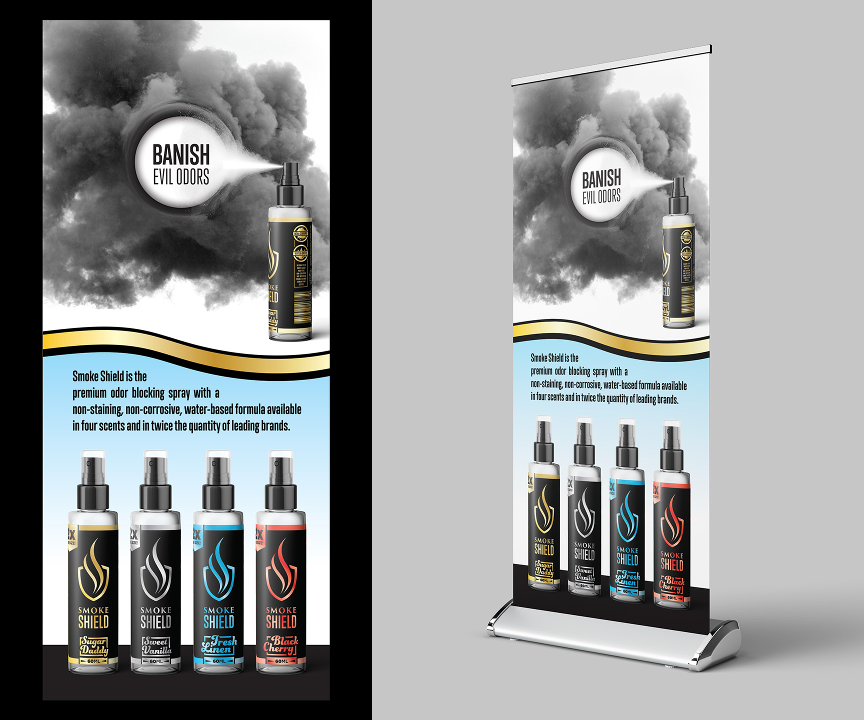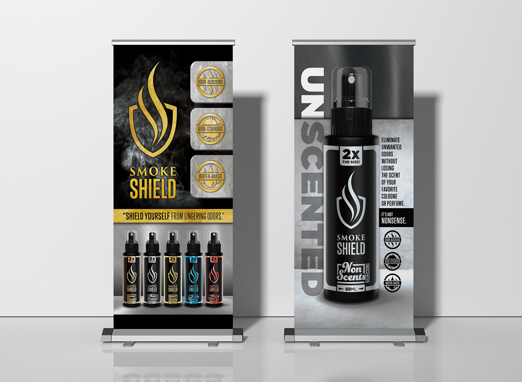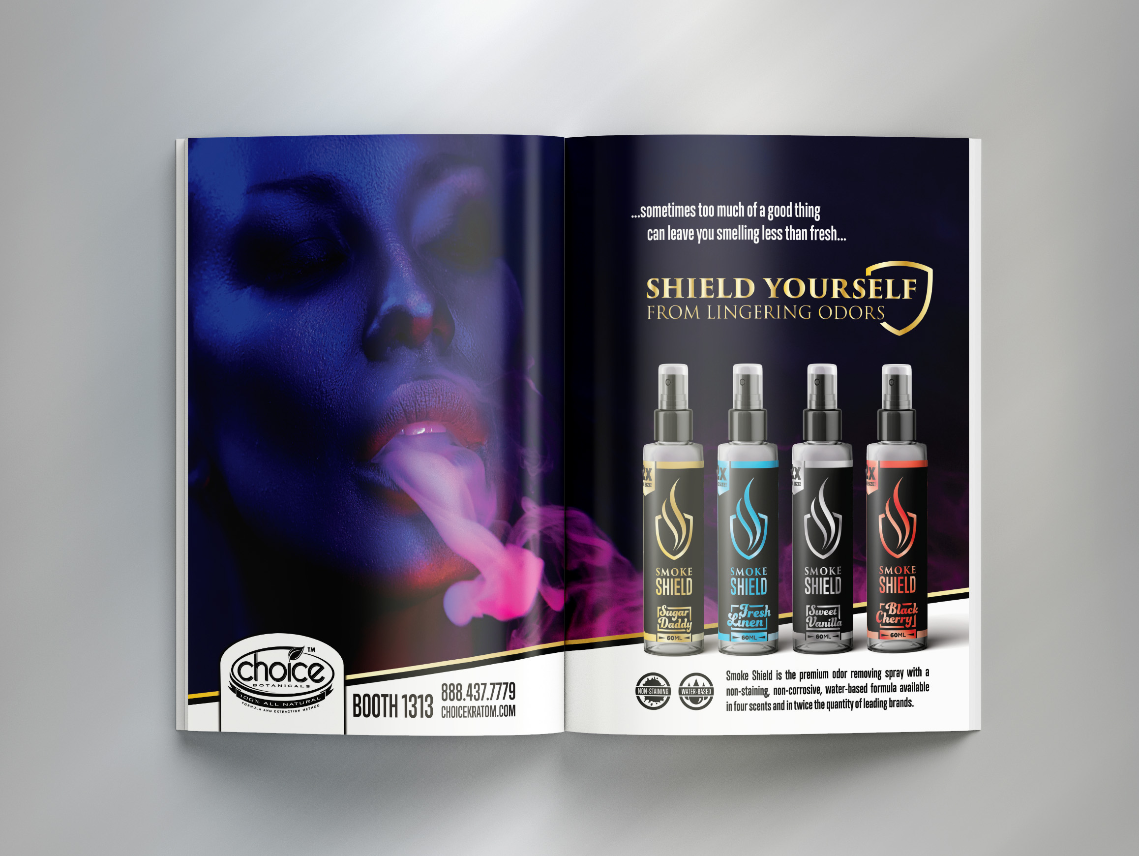 Smoke Shield was launched as a subsidiary of Choice Botanicals, the main product of which consisted of odor-eliminating sprays that blurred the line between cologne, air-freshener and deodorizer. Our key demographic was smokers who frequented smoke shops and dispensaries.